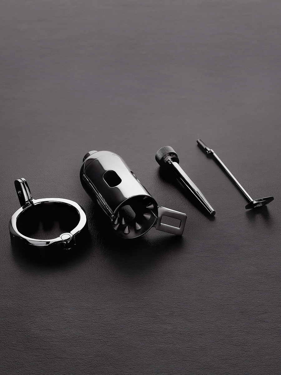 The penis cage sits comfortably in place when your penis is flaccid but bites when your penis hardens for any reason, preventing illicit activity. On the inside of the cage there are thorns that are pressed against your penis as it grows.