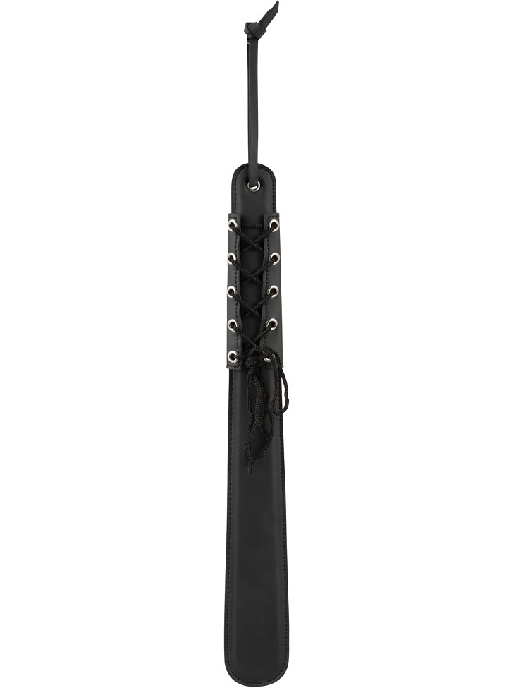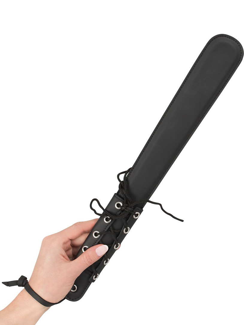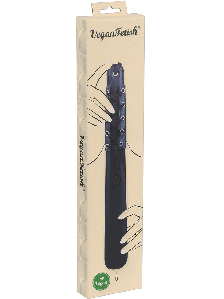 This is a beautiful and vegan paddle with a lightly padded surface and seams along the edges. The easy-to-grip handle with a loop that fastens around the wrist also has a sexy lacing that completes the look. Spank your partner and hear how it lands on your partner's bare skin.