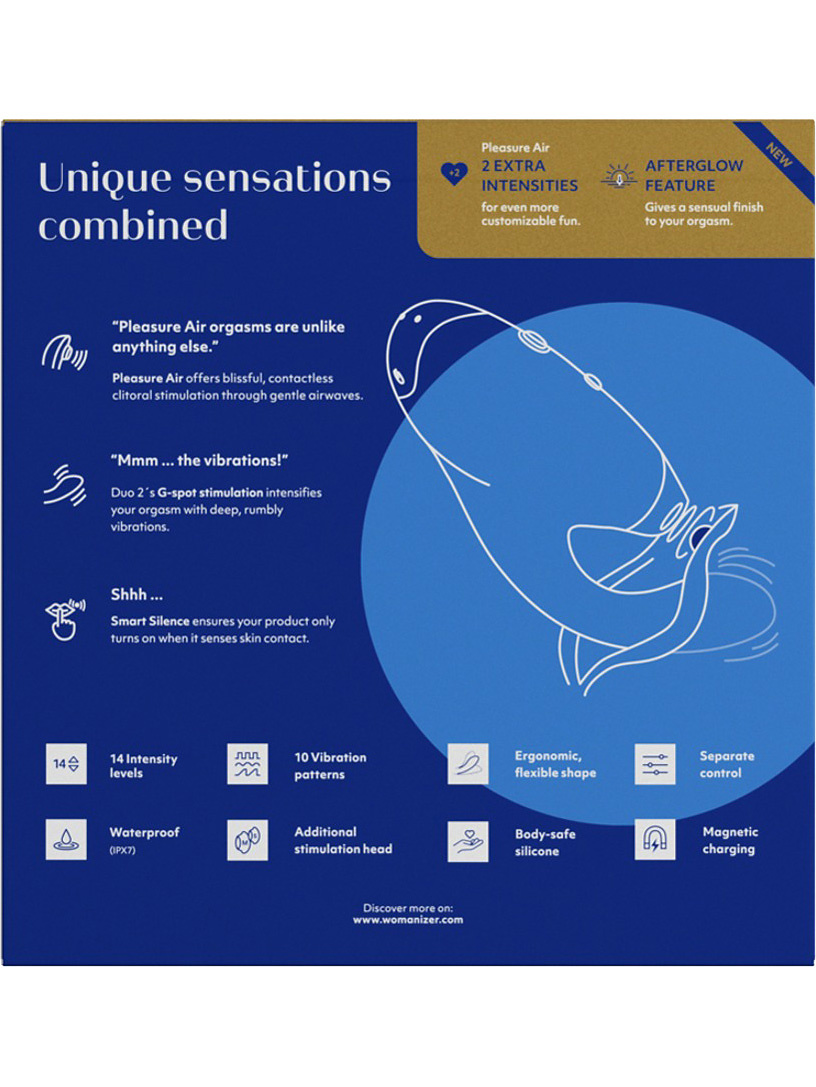 Enjoyment with even more power! The revolutionary Womanizer Pleasure Air™ technology combined with powerful G-spot stimulation – that's Duo 2 from Womanizer.