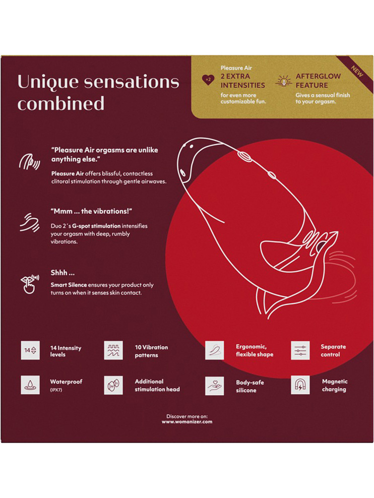 Enjoyment with even more power! The revolutionary Womanizer Pleasure Air™ technology combined with powerful G-spot stimulation – that's Duo 2 from Womanizer.