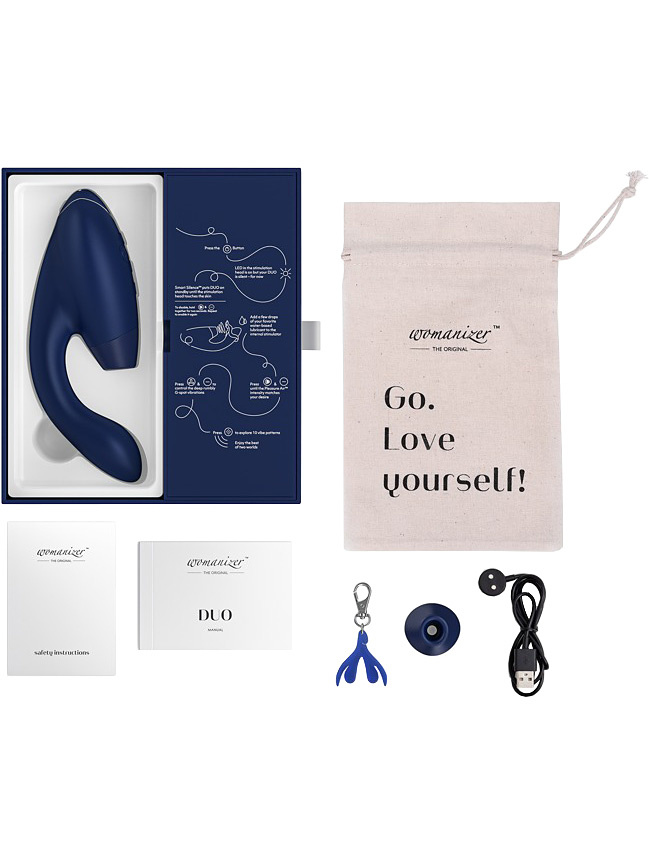 In addition to the manual and magnetic USB-cable, a quality and stylish storage bag and an extra nozzle are also included. Also included is a clitoris-shaped key-ring.