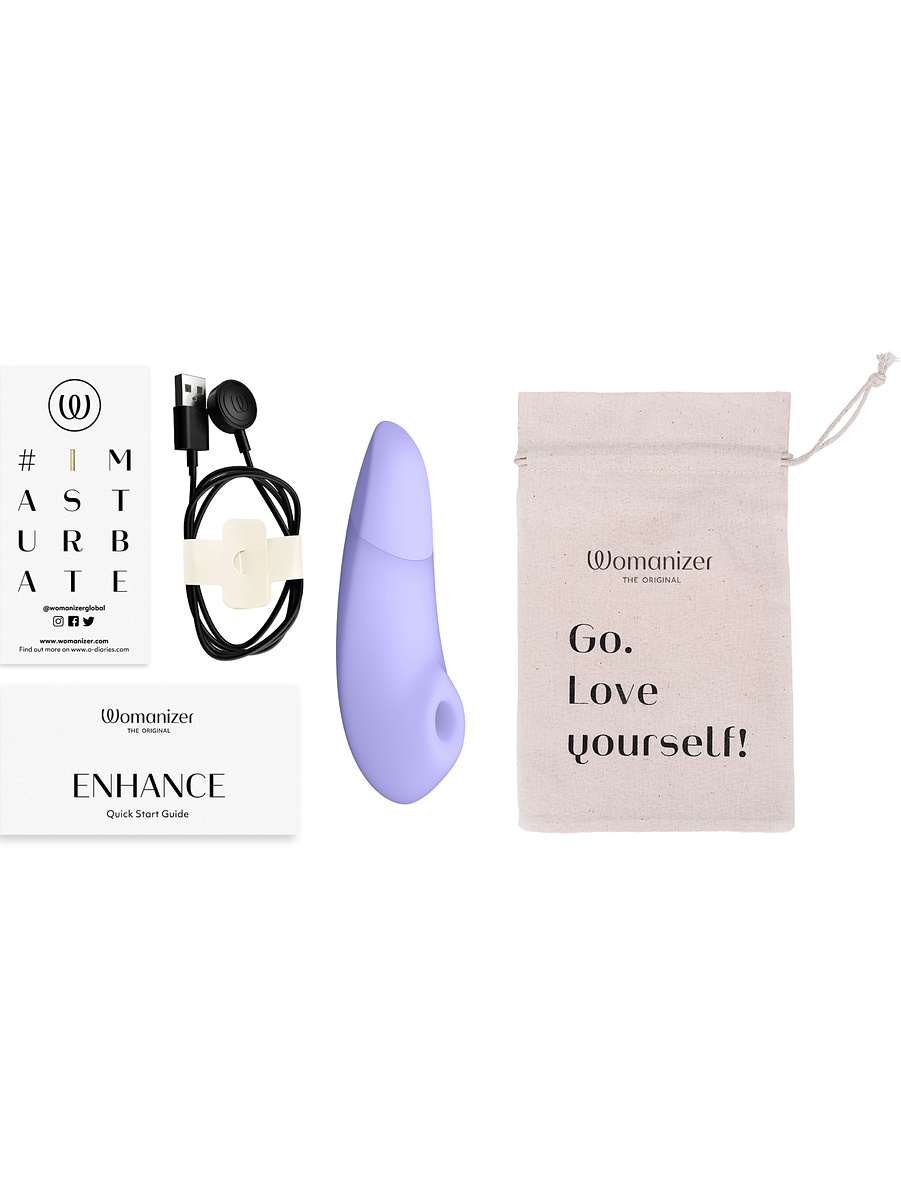 The Womanizer Enhance comes with a magnetic USB charging-cable (AC adapter not included), a quick start guide, compliance and safety information sheet, a storage pouch and #Imasturbate sticker.