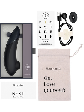 Two nozzles in different sizes are included to ensure everyone can enjoy their Womanizer. It also comes with a handy cotton storage bag, magnetic USB-cable, manual and safety instructions.