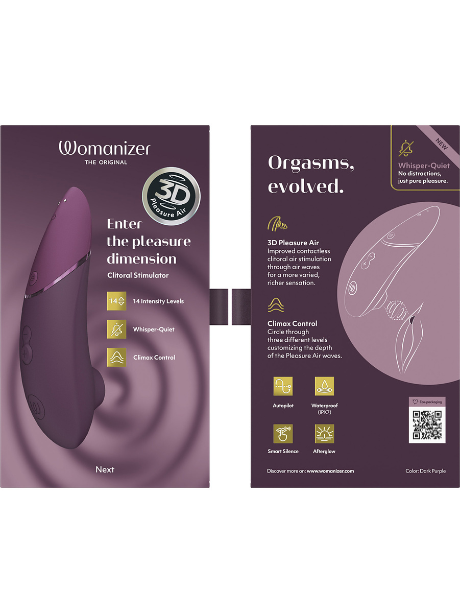 The air pressure vibrator Womanzer Next provides a new dimension of pleasure. Thanks to its revolutionary clitoral stimulation "3D Pleasure Air" and a new "Climax Control" you will experience even more depth to your orgasmic journey. Next provides a natural experience and new customizable stimulation-patterns - designed for intense and multiple orgasms!