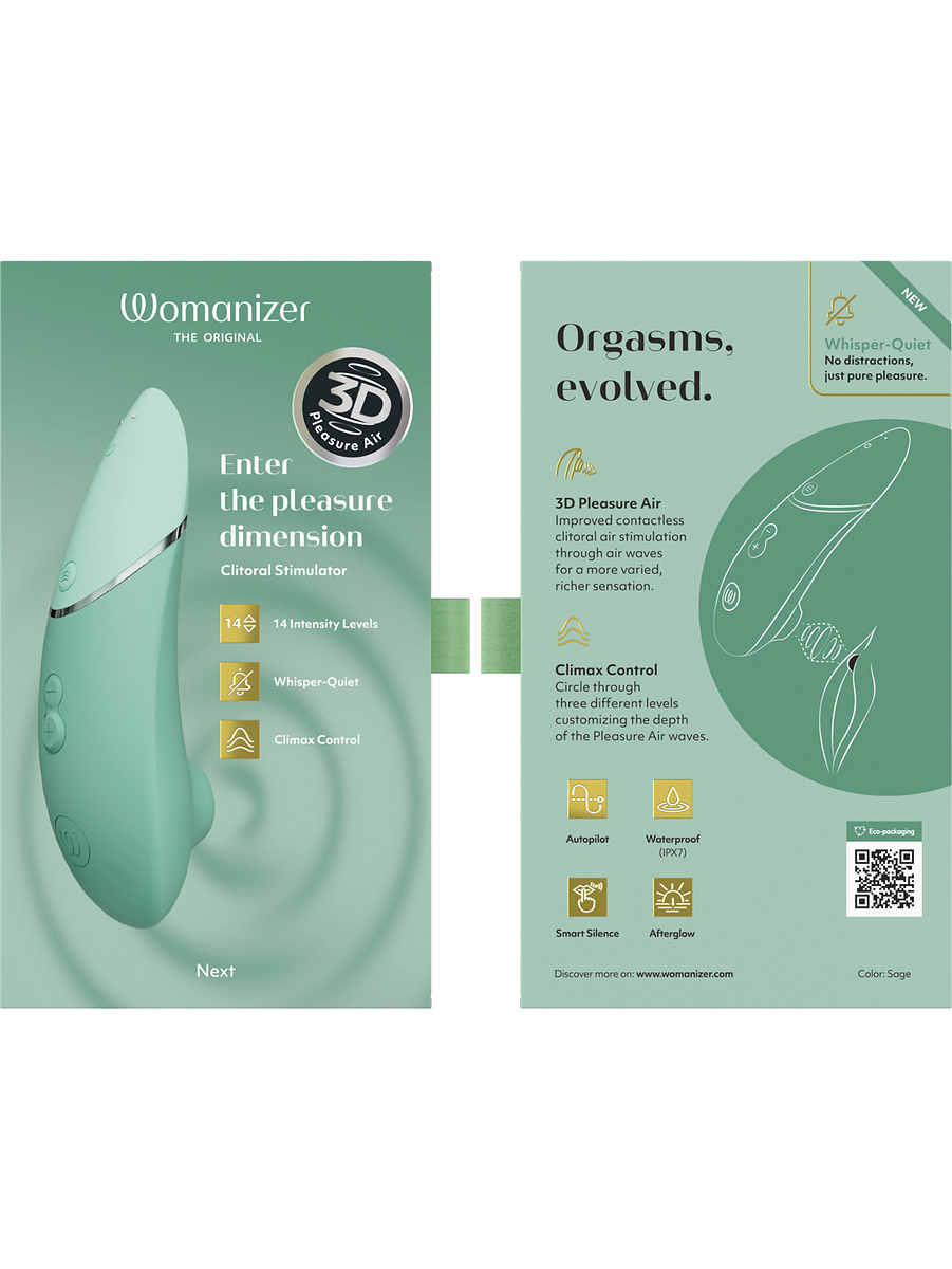 The new Climax Control-feature creates a deeper and more enriching sensation that takes the Womanizer's original Pleasure Air-stimulation to a whole new 3D dimension. Now you can control not only the speed and intensity-level, but also the depth of the airwaves. With 3 levels of Climax Control, Next offers a more nuanced journey with multiple orgasms.