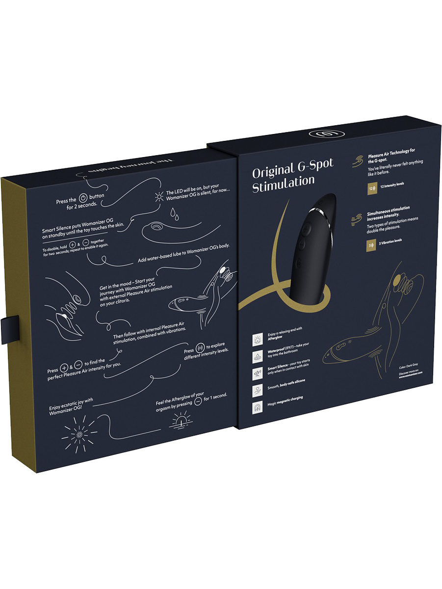 The Womanizer OG is the first G-spot vibrator to combine targeted Pleasure Air and vibrations for a powerful and orgasmic ride. Suction-like air pressure and vibrations will pamper your G-spot with unprecedented pleasure. Two types of functions clearly mean twice as much enjoyment.