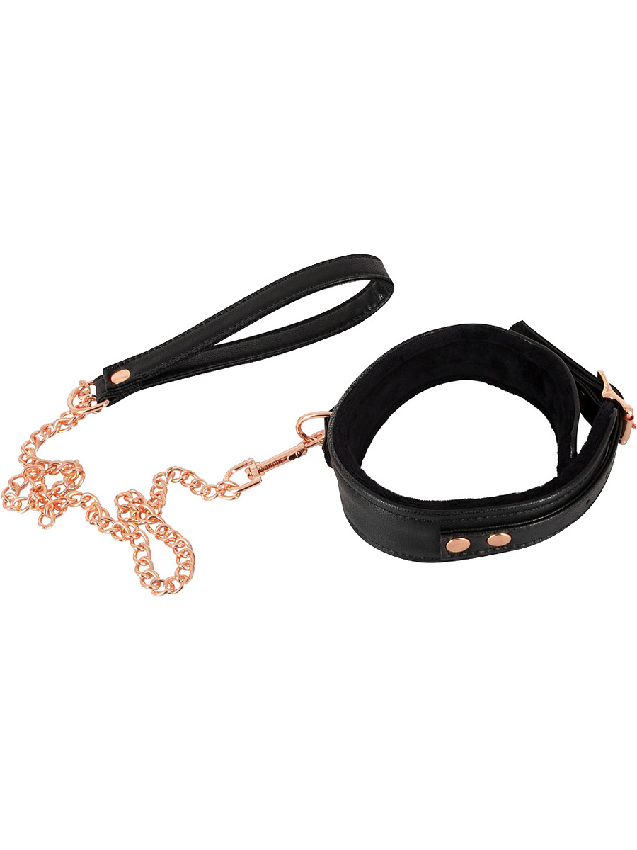 A stylish necklace with a leash from Bad Kitty in a black leather look (PU leather) with a rosegold chain and details. The collar has soft plush on the inside that provides high comfort, while the ring at the front allows you to attach the leash.