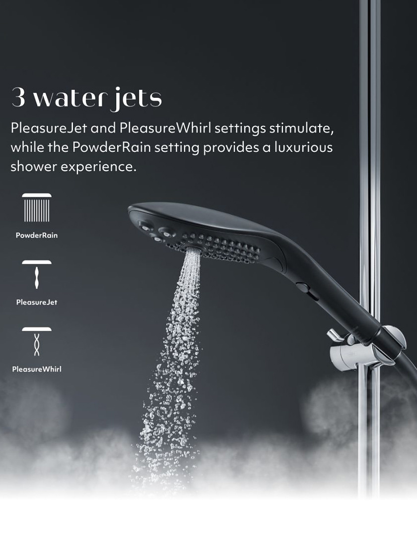 2. Switch between the PowderRain setting for a luxurious shower to sensual massage with PleasureWhirl and powerful pulsation with PleasureJet.