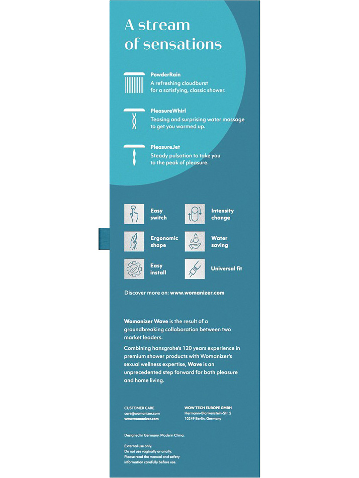 Womanizer Wave is the first product ever to combine a shower head and a water massaging clitoris-stimulator. With the expertise of bathroom experts Hansgrohe and pleasure pioneers Womanizer, a unique 2-in-1 product has been developed: the Wave shower head - for both showering and pleasure.