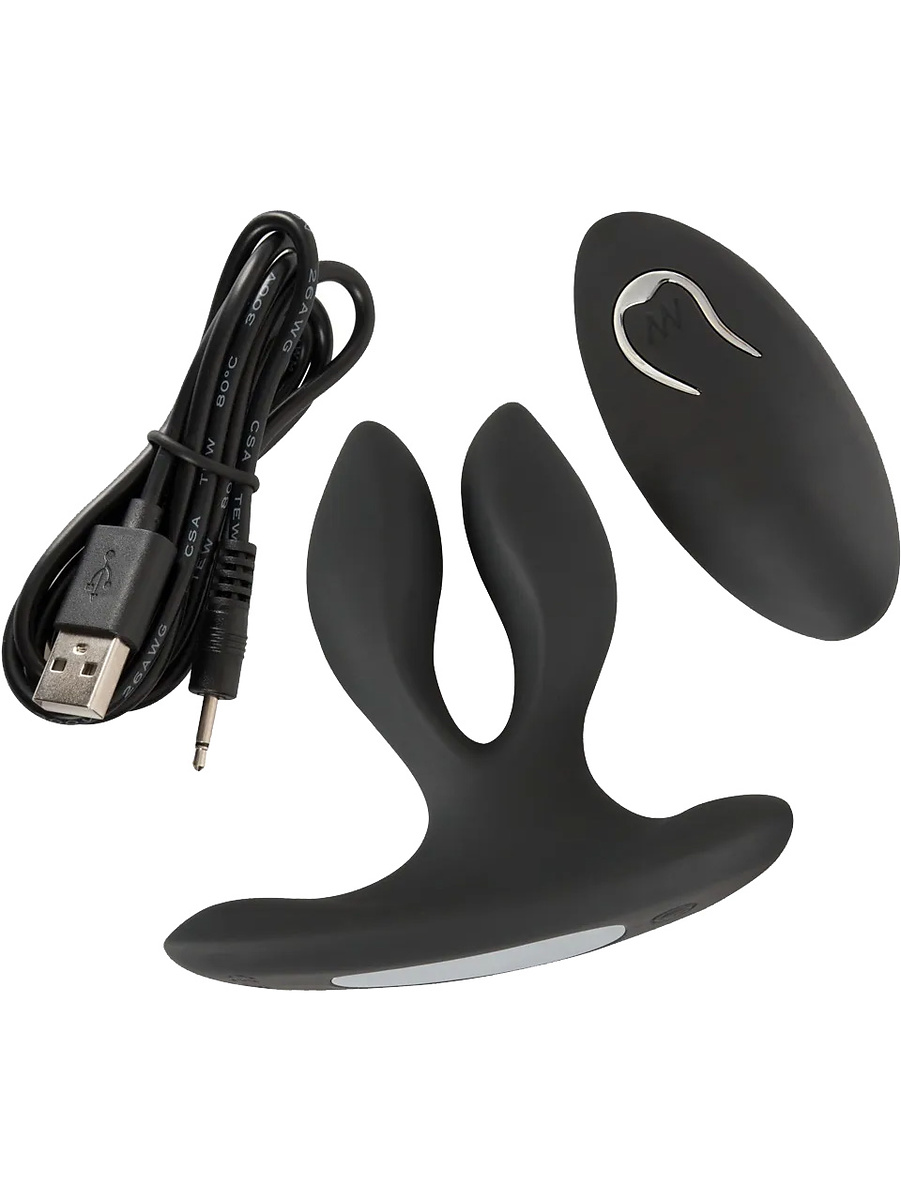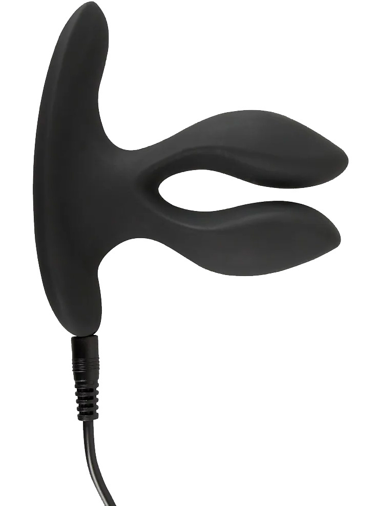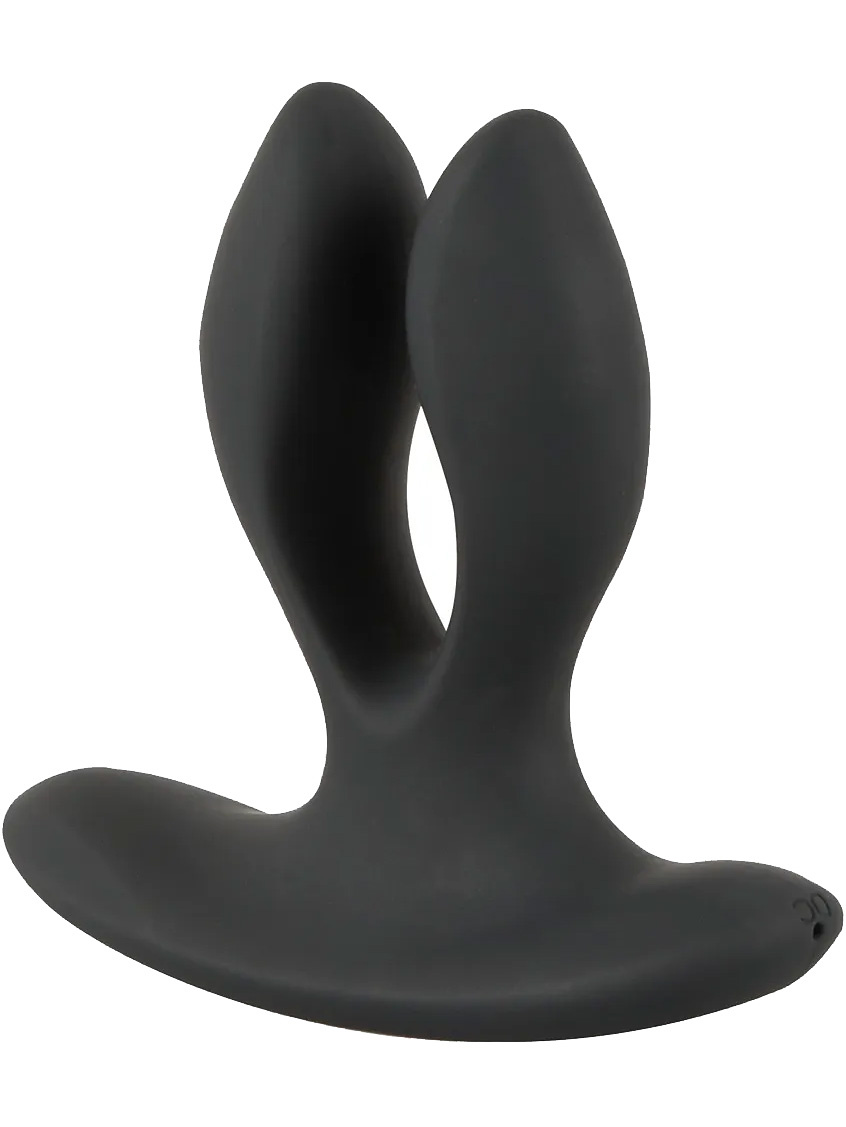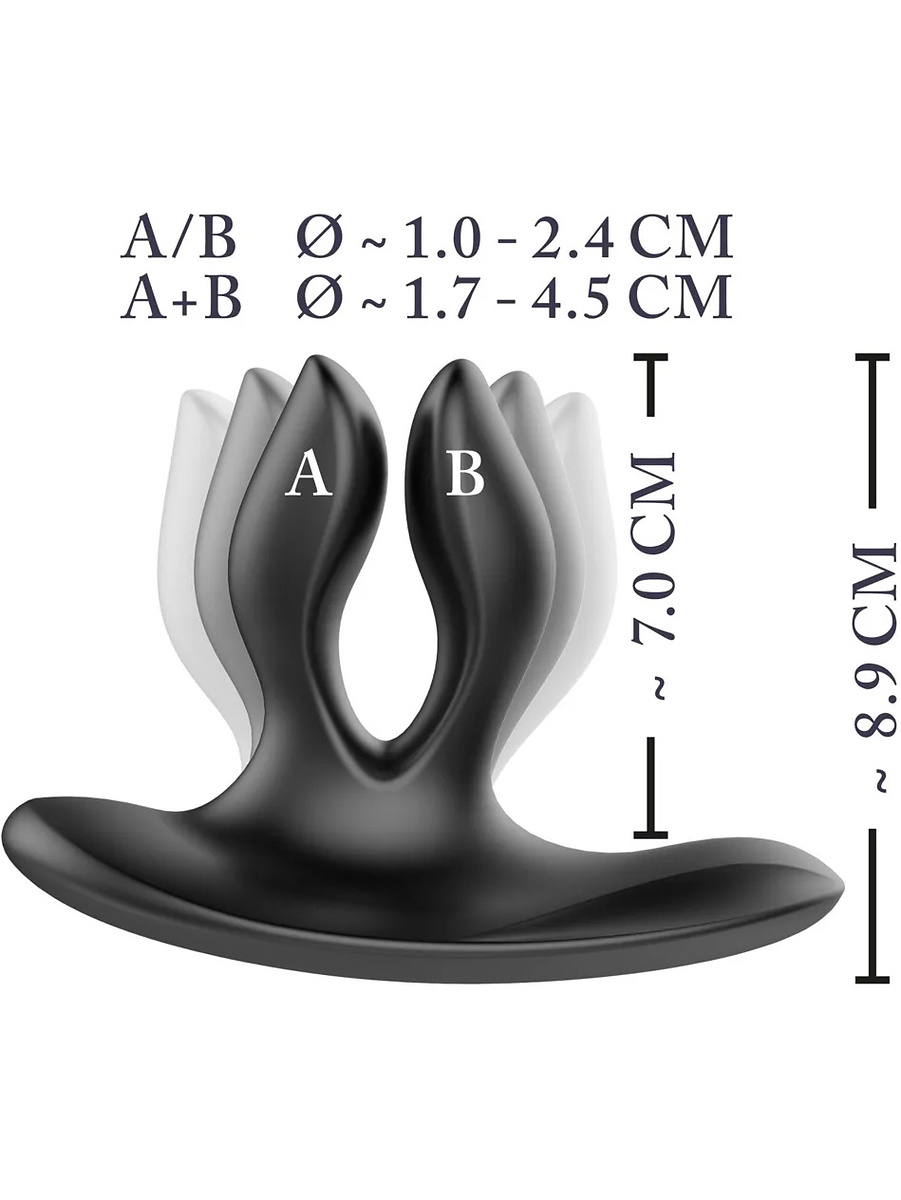 This is a vibrating and expanding butt plug with two arms and a stimulating base for the pelvic floor. Squeeze the flexible arms before inserting the butt plug. When the plug is in place, the arms will be pressed out against your inner walls for a filling feeling and pleasurable stimulation.
