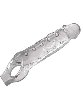 This penis extender adds both length and girth while the textured interior massages your penis throughout the act. The flexible TPR-material feels realistic and moves with you without feeling bulky. The included ring fits around your testicles, giving a more secure grip and a tightening effect that enhances your erection.