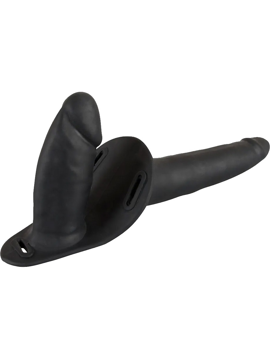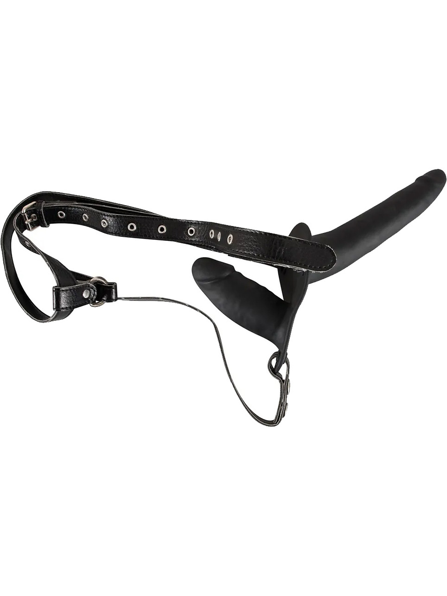 Double Strap-On is a nice Strap-On that lets you both enjoy during penetration-play together. The harness in artificial leather is adjustable with a buckle and holes for the best fit. The smaller dildo is placed vaginally on the carrier so she can also enjoy when she penetrates her partner.