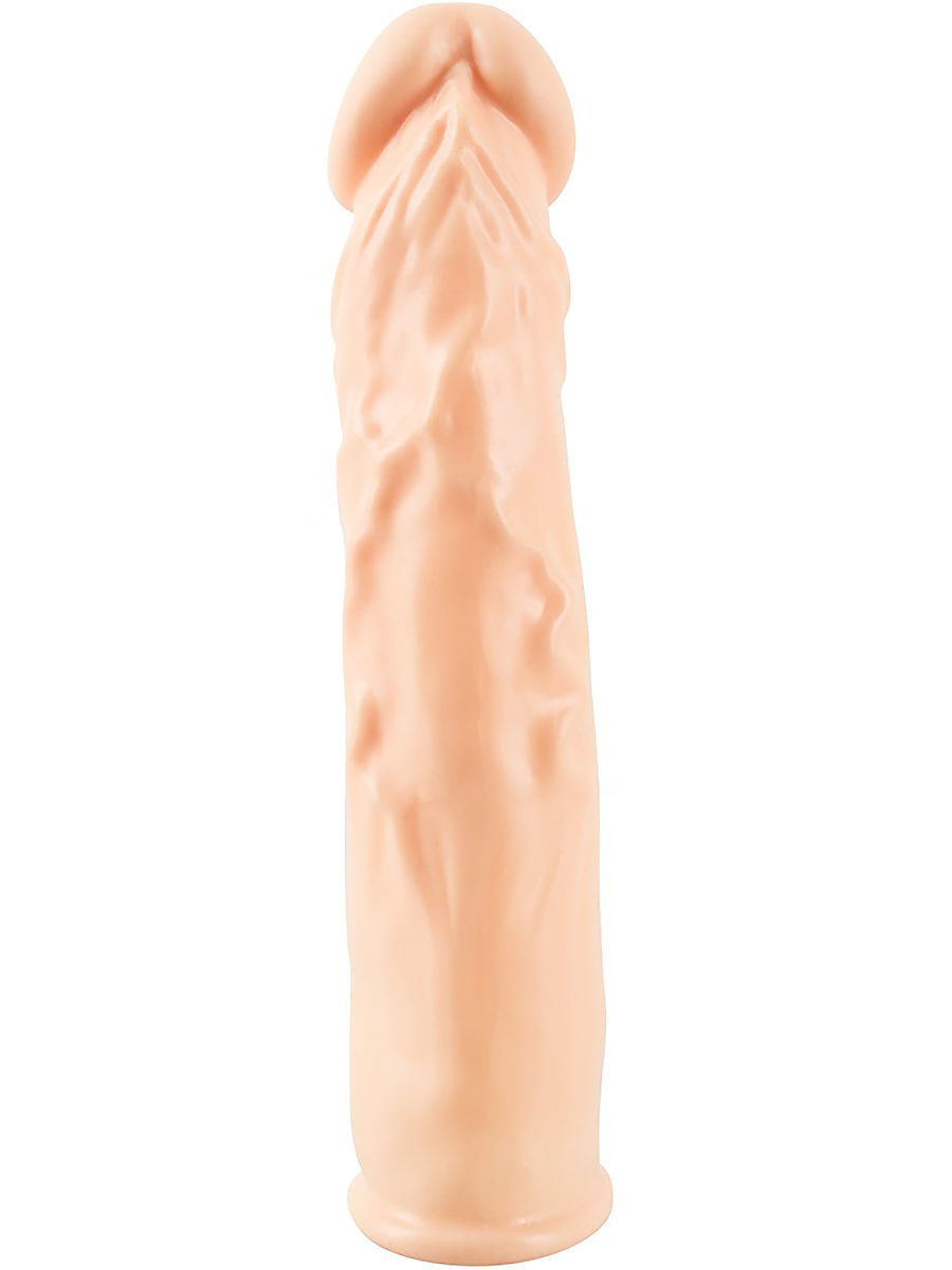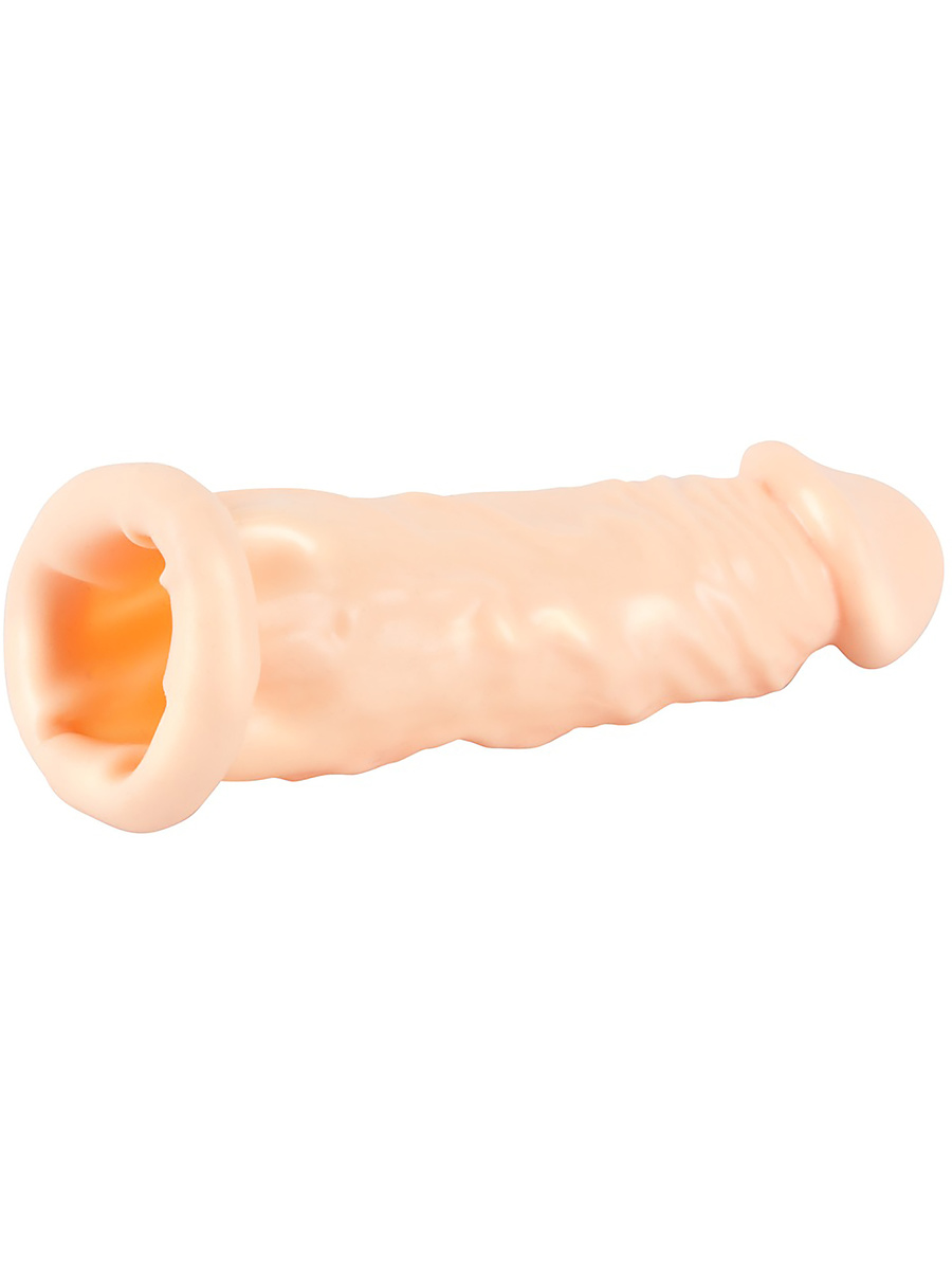 This penis extender is made of extremely soft silicone which makes it very flexible and comfortable to use. The millimeter-thin sleeve has a realistic design with pulsating veins and a marked glans that lengthens your penis by 2.5 cm.