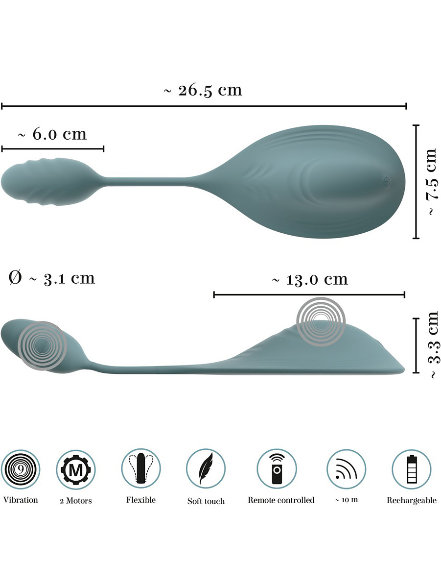 The Vibepad Mini is equipped with 2 powerful but quiet motors: one in the vibration-plate and one in the egg. Together, they offer 9 synchronized vibration-modes that provide great variety and intense double stimulation. The modes are easily controlled with the touch of a button, either directly on the Vibepad Mini or via the practical wireless remote. With a range of up to 10 meters, your partner can also take control of the pleasure.