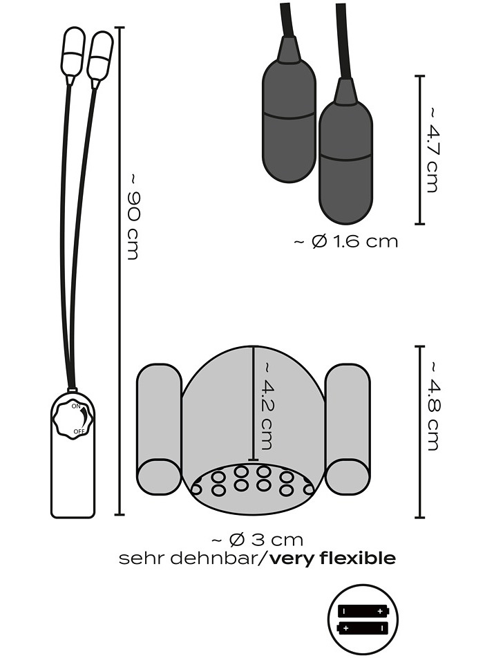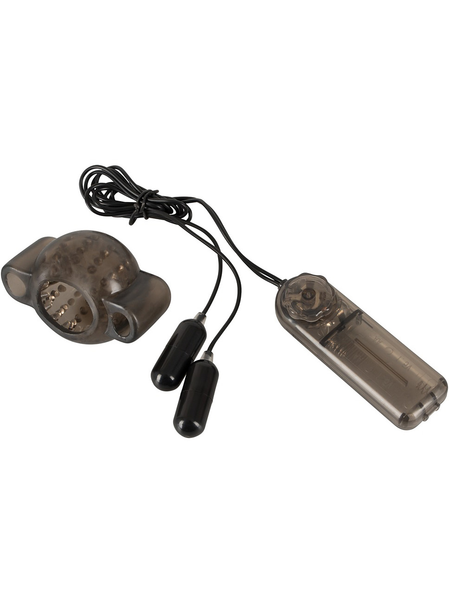 Place the two bullet-vibrators in the holders on the sides and apply water-based lubricant to smoothly thread the sleeve over your glans. Via the wired control box, you can then control its multispeed-vibrations and choose the speed that suits you best at the moment.